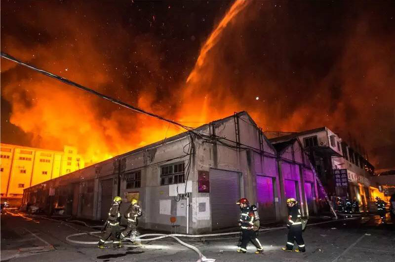 火災(zāi)發(fā)生在東門大廈北面的一個城中村,火勢極大,艮山西路停了40多輛消防車,僅留一個車道供東向西車附近的艮山西路和新塘路出現(xiàn)大面積擁堵。圖為火勢蔓延到周邊倉庫,消防員在現(xiàn)場奮力撲救。