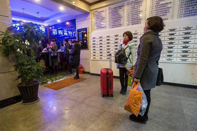 .東門大廈這邊有兩個酒店:東門賓館和布丁酒店。晚上8點(diǎn)多,住客都被叫起來?!百e館把我們趕下來了,說火勢太大,怕蔓延過來?!辈级【频暌粋€年輕女孩蹲在大門旁邊,呆呆地看著來來往往的行人。她實(shí)在無聊,便抽起了煙。圖為緊鄰火場的一家賓館,住客紛紛退房離開。